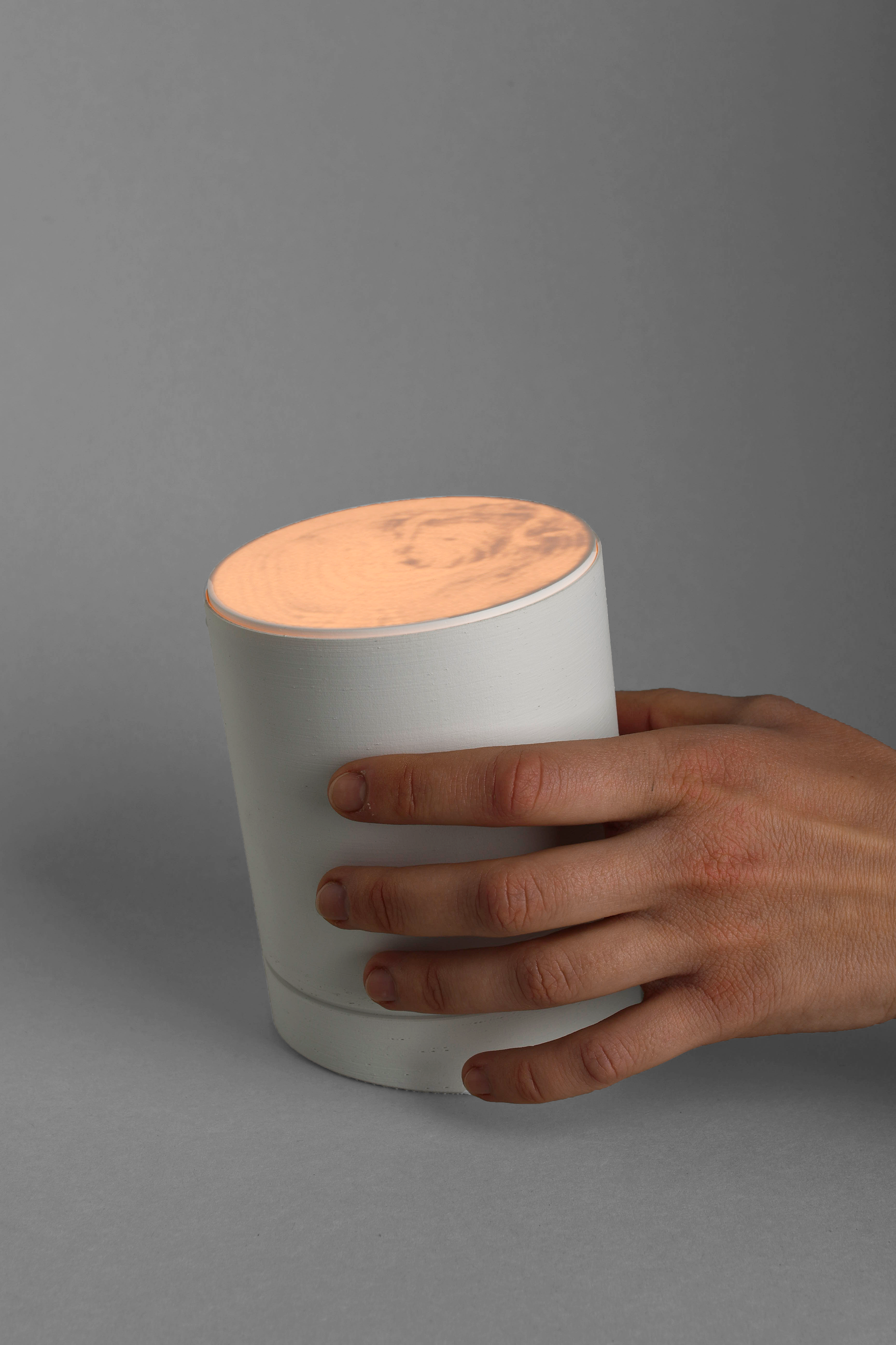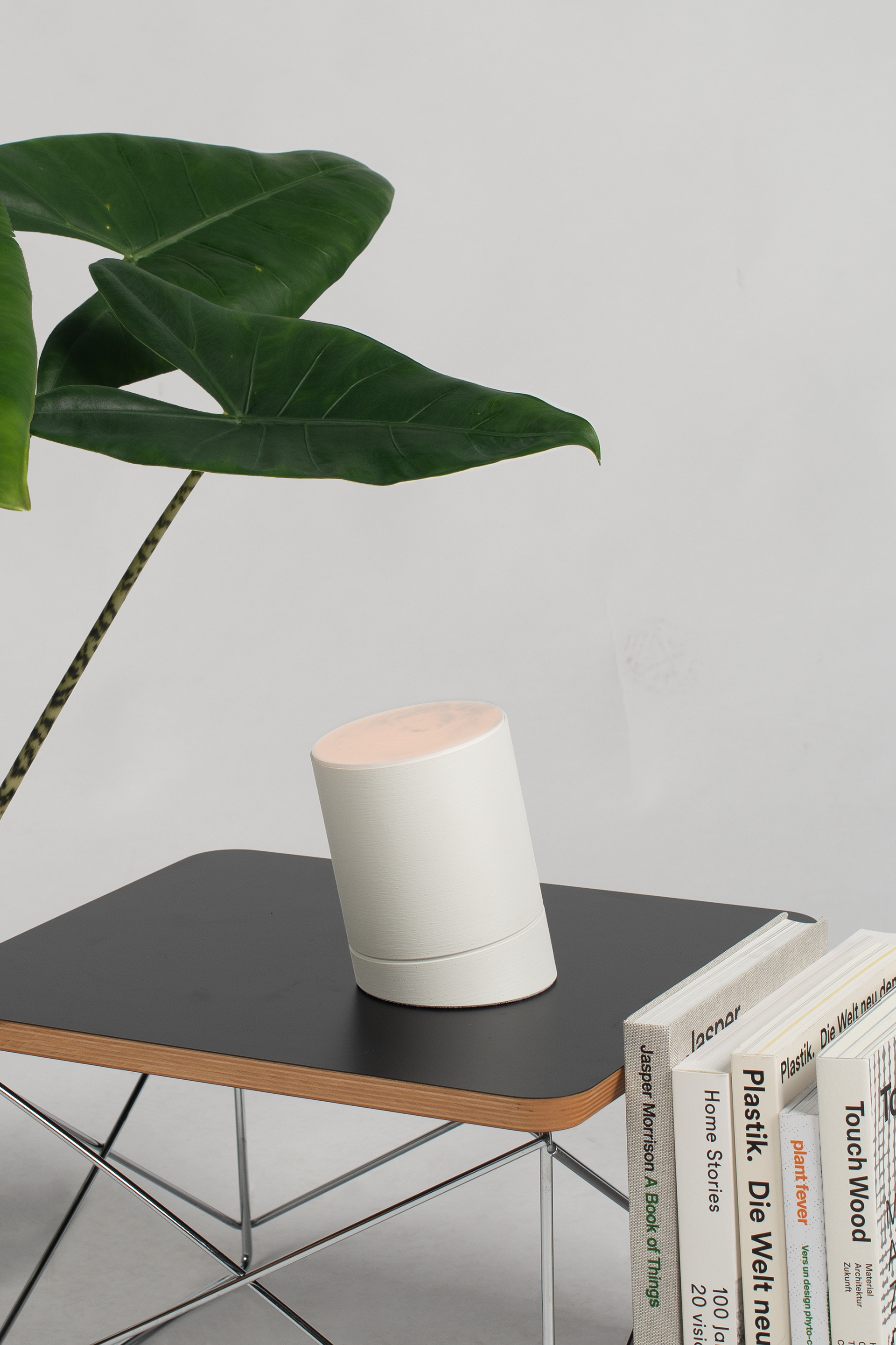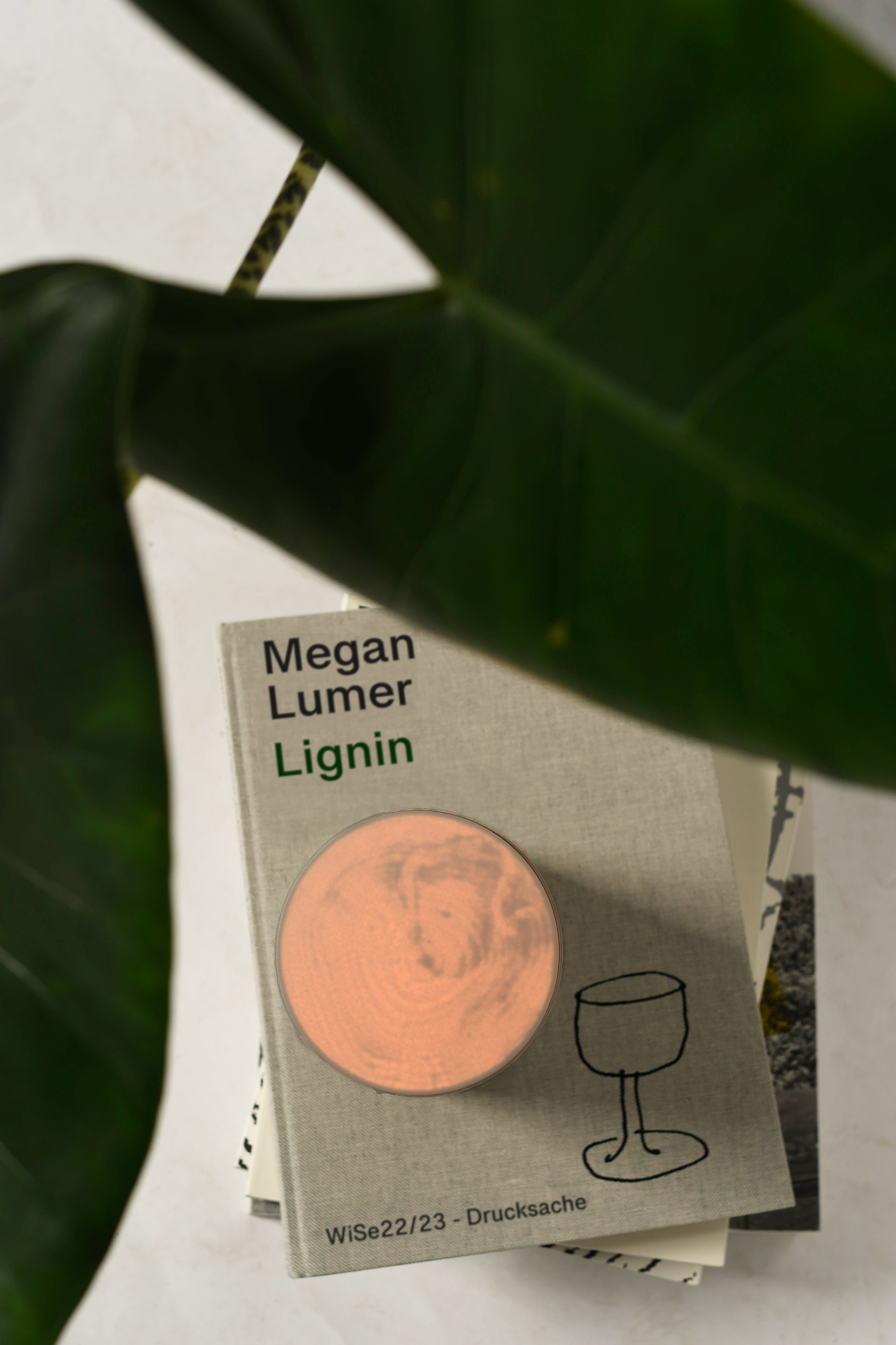 Lignin schafft Licht für eine gemütliche Atmosphäre. Ob bei einem Glas Wein oder gemütlichen Gespräch am winterlichen Nachmittag, sorgt sie für stimmungsvolles Licht. Natürliche und digitale Strukturen kombiniert mit warmem Licht sorgen für einen Überraschungseffekt auf der sonst so schlichten, weißen, klaren Zylinderform. Lignin als Stützmaterial in der Pflanze ist essenziell für die Stabilität und Festigkeit. Die im 3D Druck Verfahren erstellte schräge Form der Leuchte ist nicht anders zu erzeugen als mit digital erzeugtem Stützmaterial. Natürliches Wachstum, Nähstoff- und Wassertransport geschehen von unten nach oben. Diese Richtung nimmt auch das Licht und lässt die Leuchte oben auf verschiedene Art und Weise in den wechselbaren Leuchtscheiben erstrahlen.