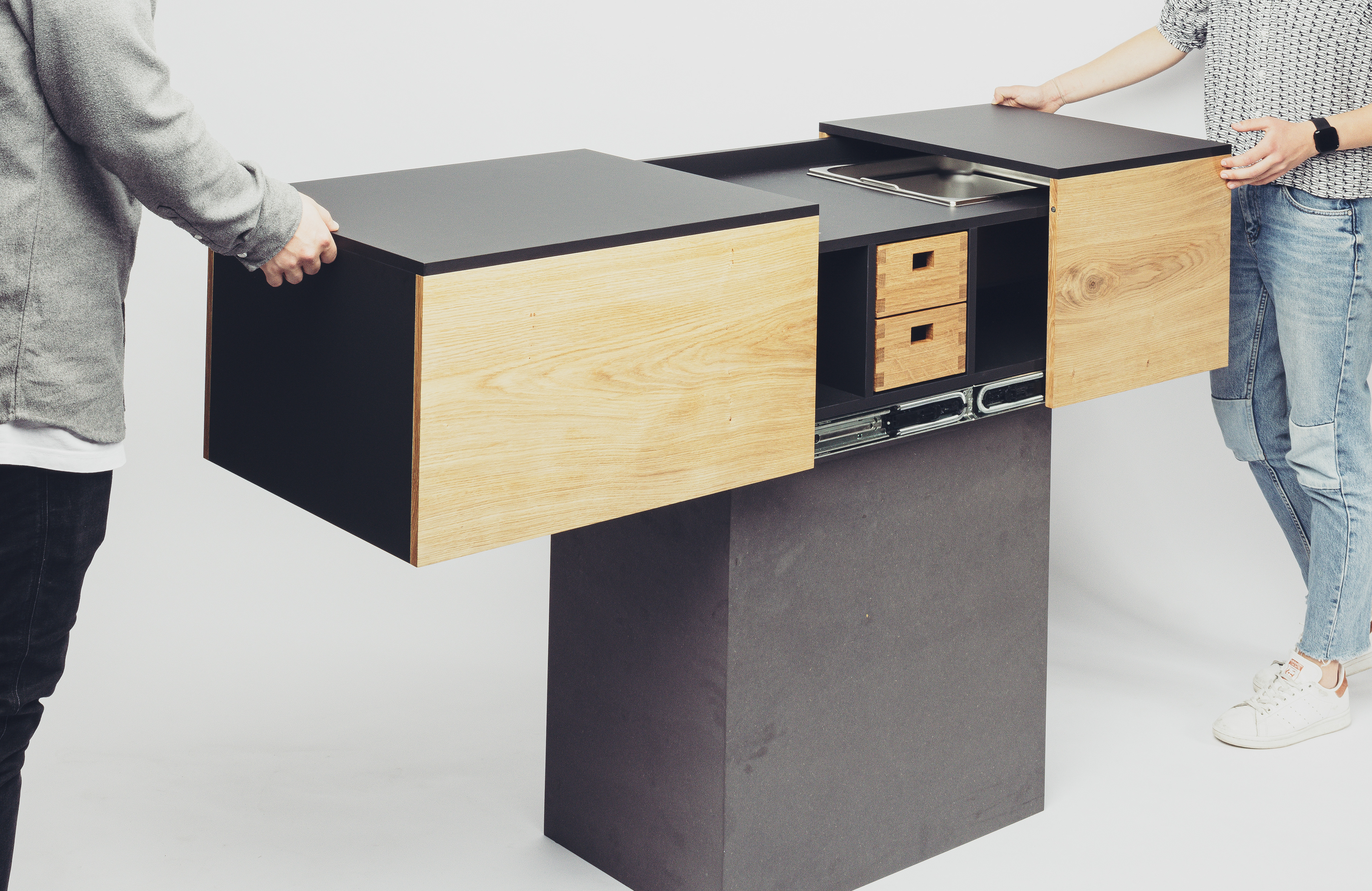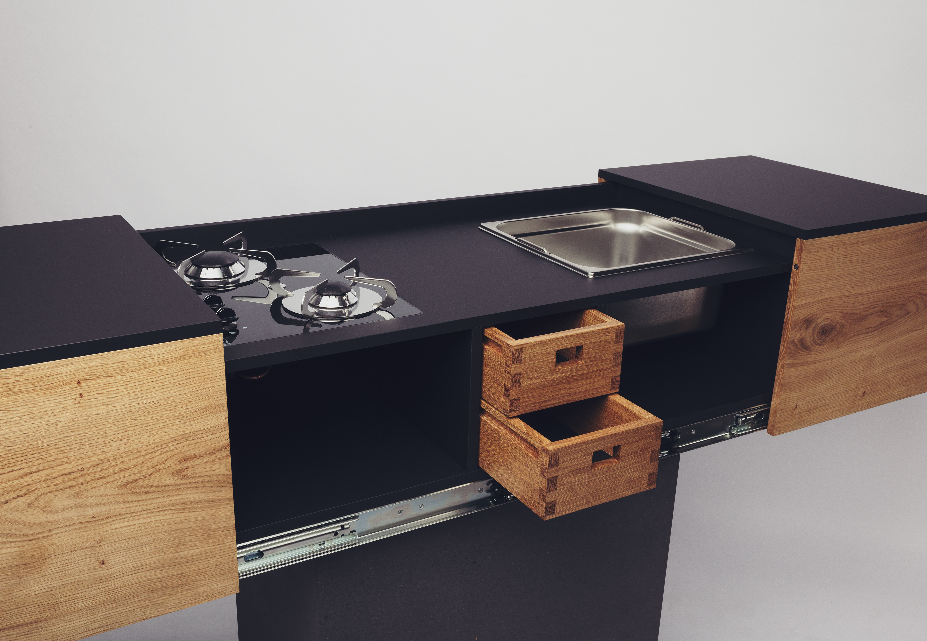Der Überraschungseffekt war wohl recht groß als die Prüfungskommission meine Küche aufschob. Von außen war sie nicht als solche zu erkennen und es wurde wild geraten was sich im Gehäuse versteckt. Gleichzeitig gefiel ihnen meine Materialauswahl samt entsprechender Gestaltung sowie die handwerklich saubere Verarbeitung - so die Worte in der Rede, bei der Preisverleihung des ersten Preises im Wettbewerb „Die gute Form“.