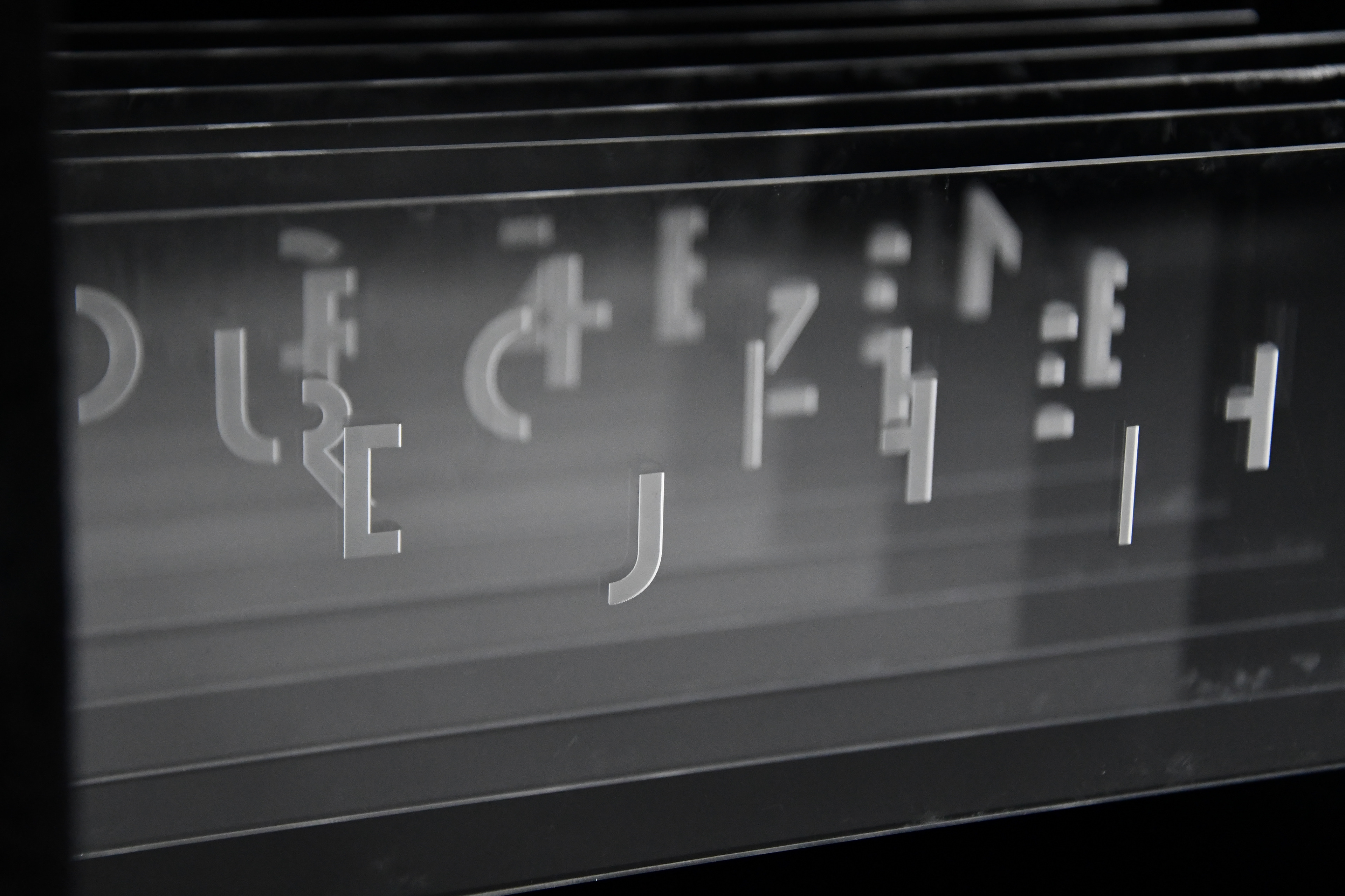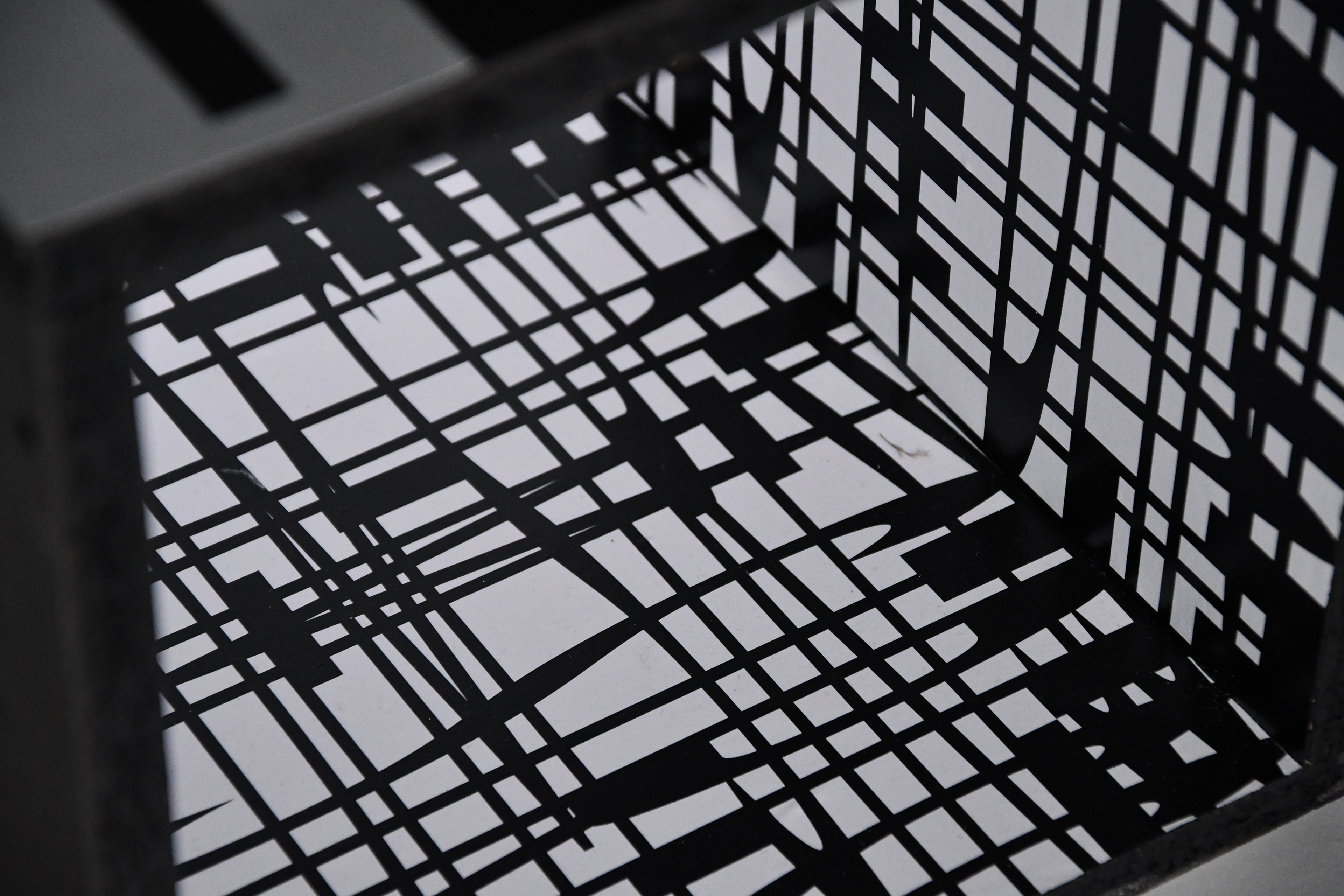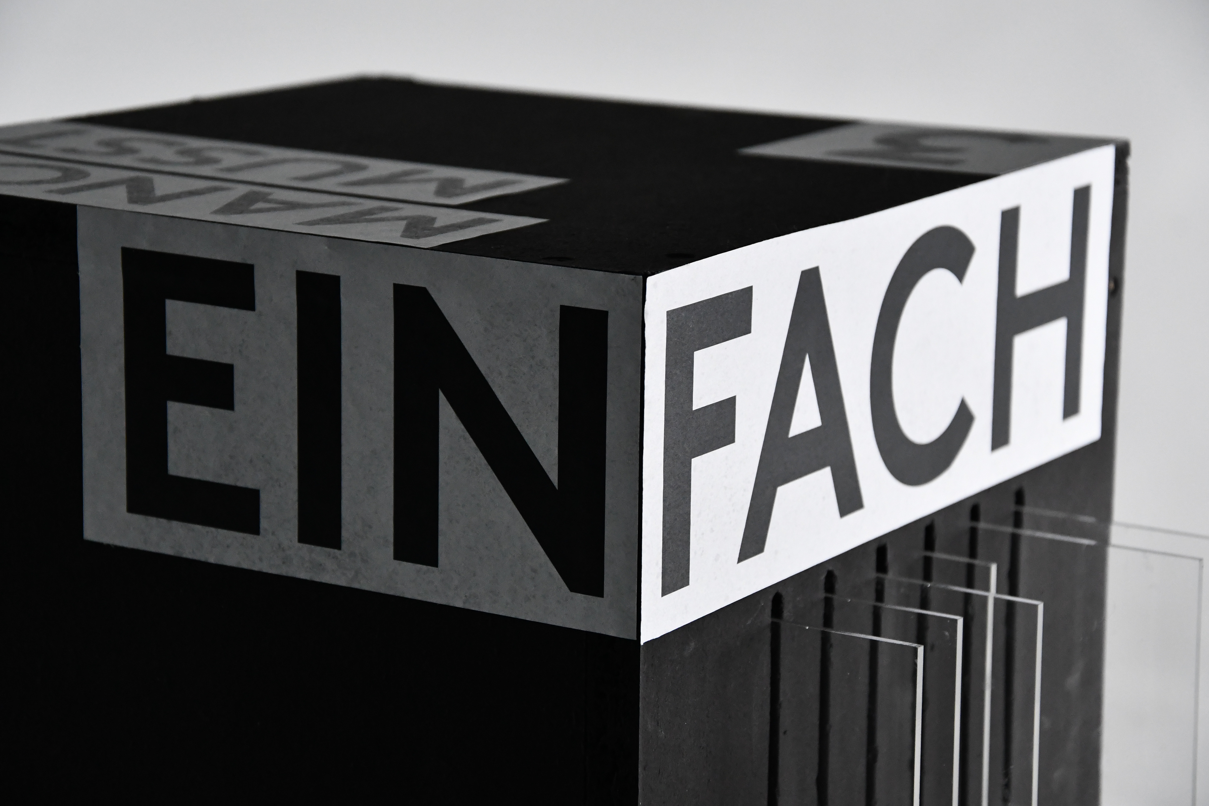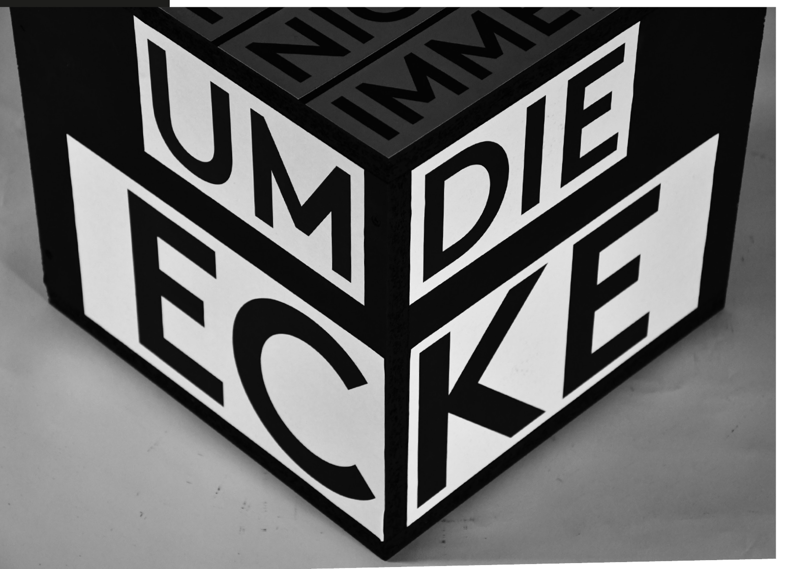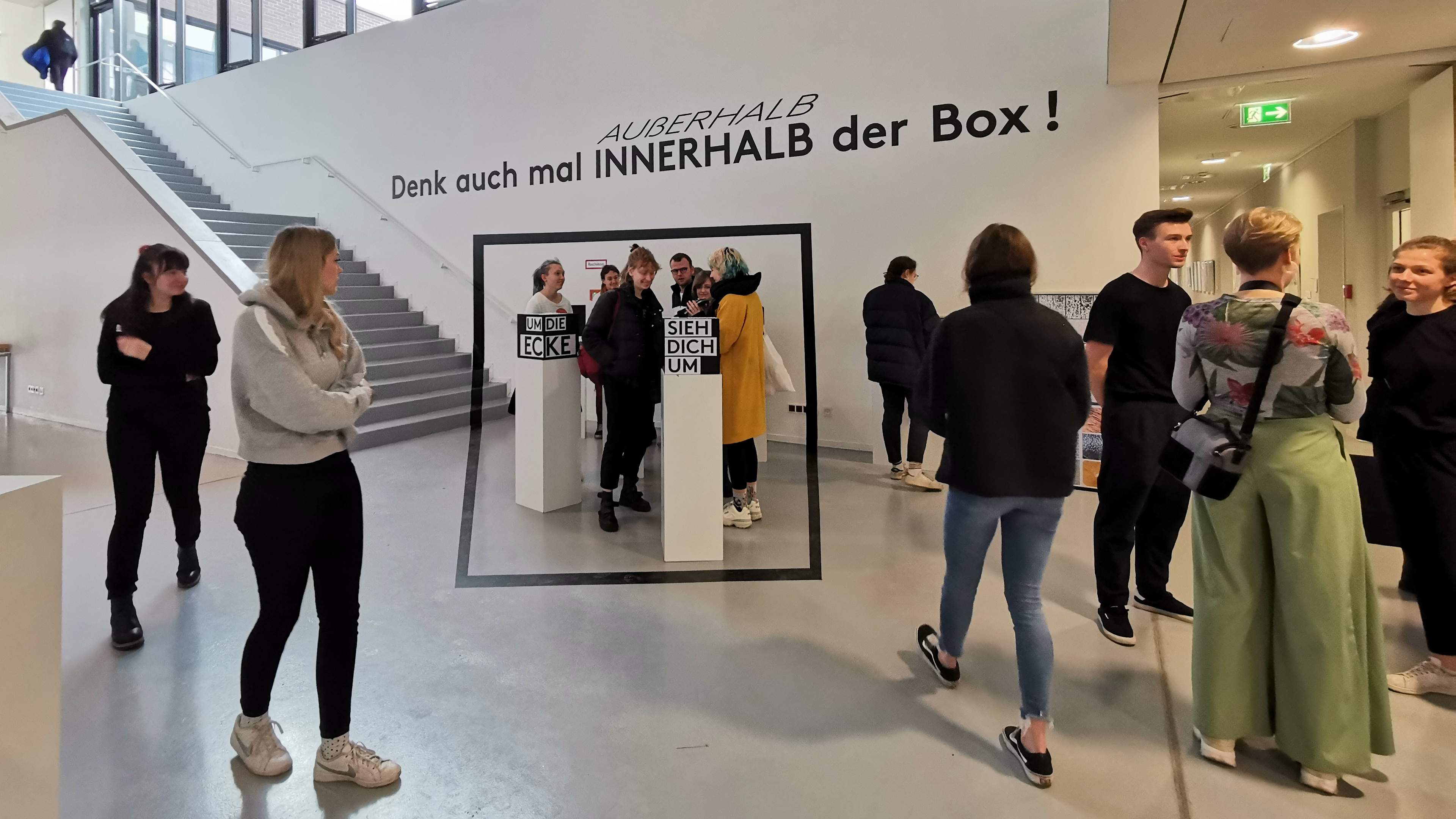 Höhepunkt unserer Installation sollte eine perspektivische Verzerrung an der Wand im Ausstellungs-Forje werden. Dazu haben wir die Lokation vermessen und in Rhino nachgebildet. Im Anschluss haben wir die größte Box so auf Boden, Treppe und Wand projiziert, dass wir die perspektivische Verzerrung umgekehrt haben. Der Schriftzug sollte diesen Effekt deutlich machen, indem er unverzerrt aufgebracht wird.